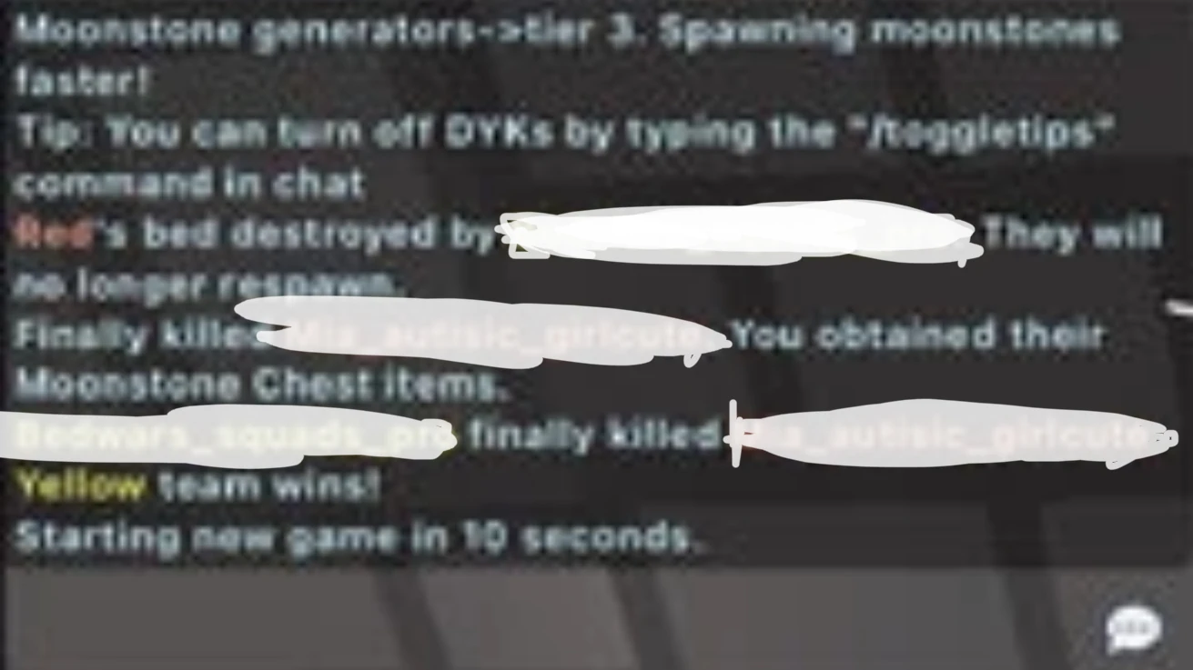 The old chat box in Bedwars (names blurred out for privacy).