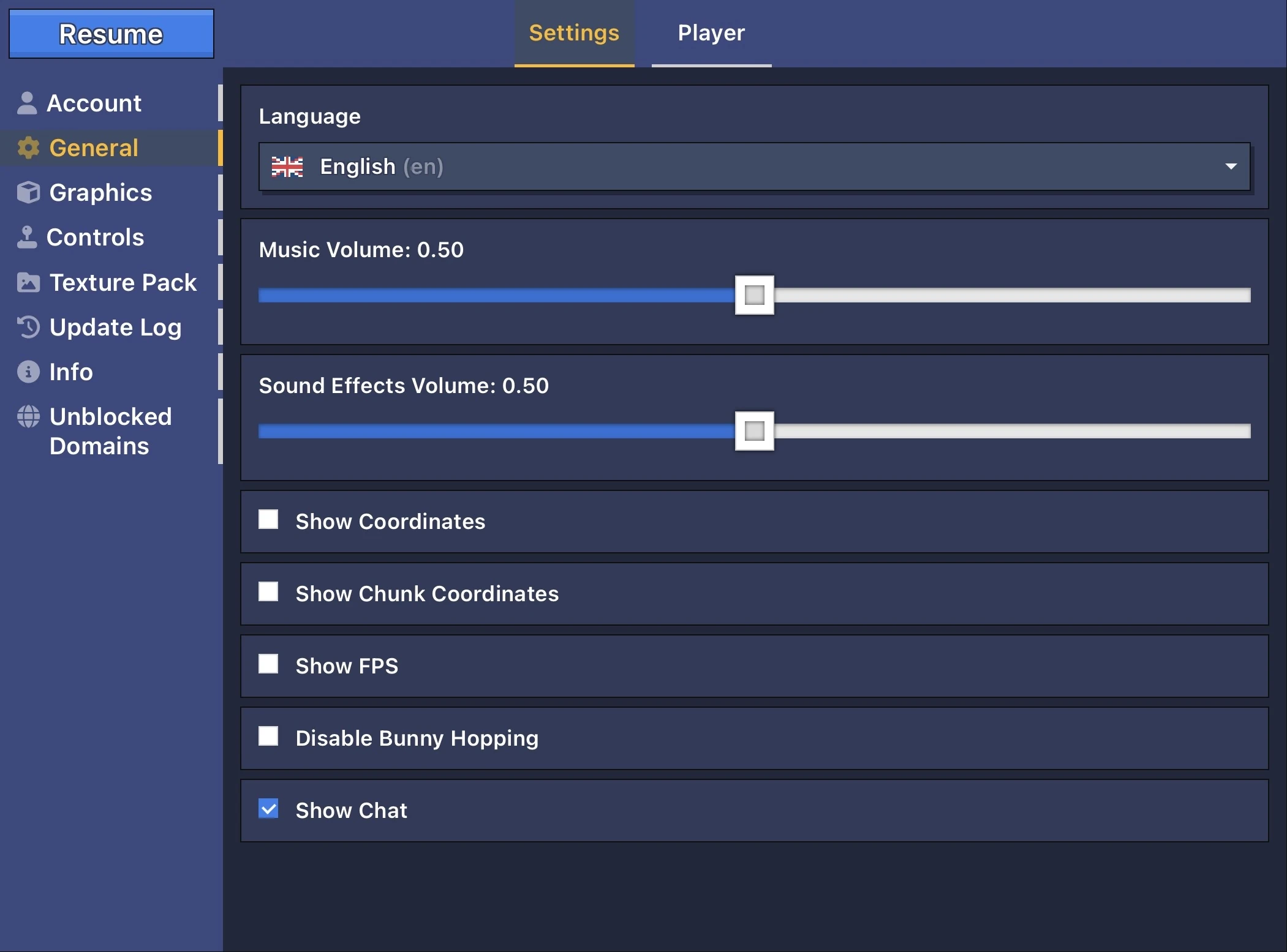Selects the texture pack you use for the game. See here for more. You need to reload the page when you choose another texture pack in order to apply it.