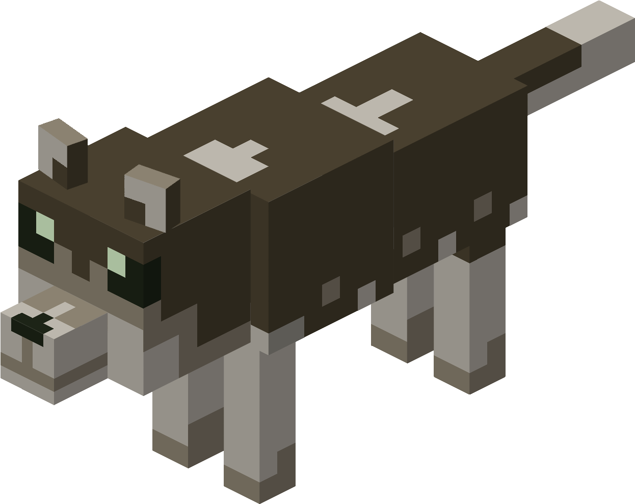 Wolves have multiple variants. Currently, they can be dark brown, grey, dark grey, brown or cyan with cyan spots, resembling the colour of spectral logs and leaves. Spectral (cyan) wolves can only spawn in frozen badlands.